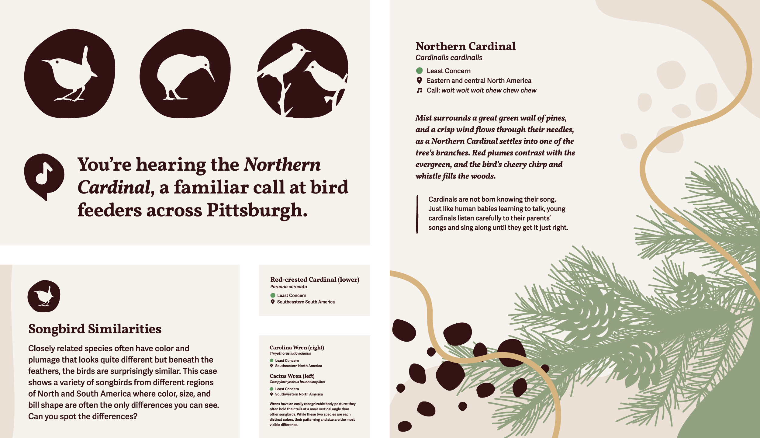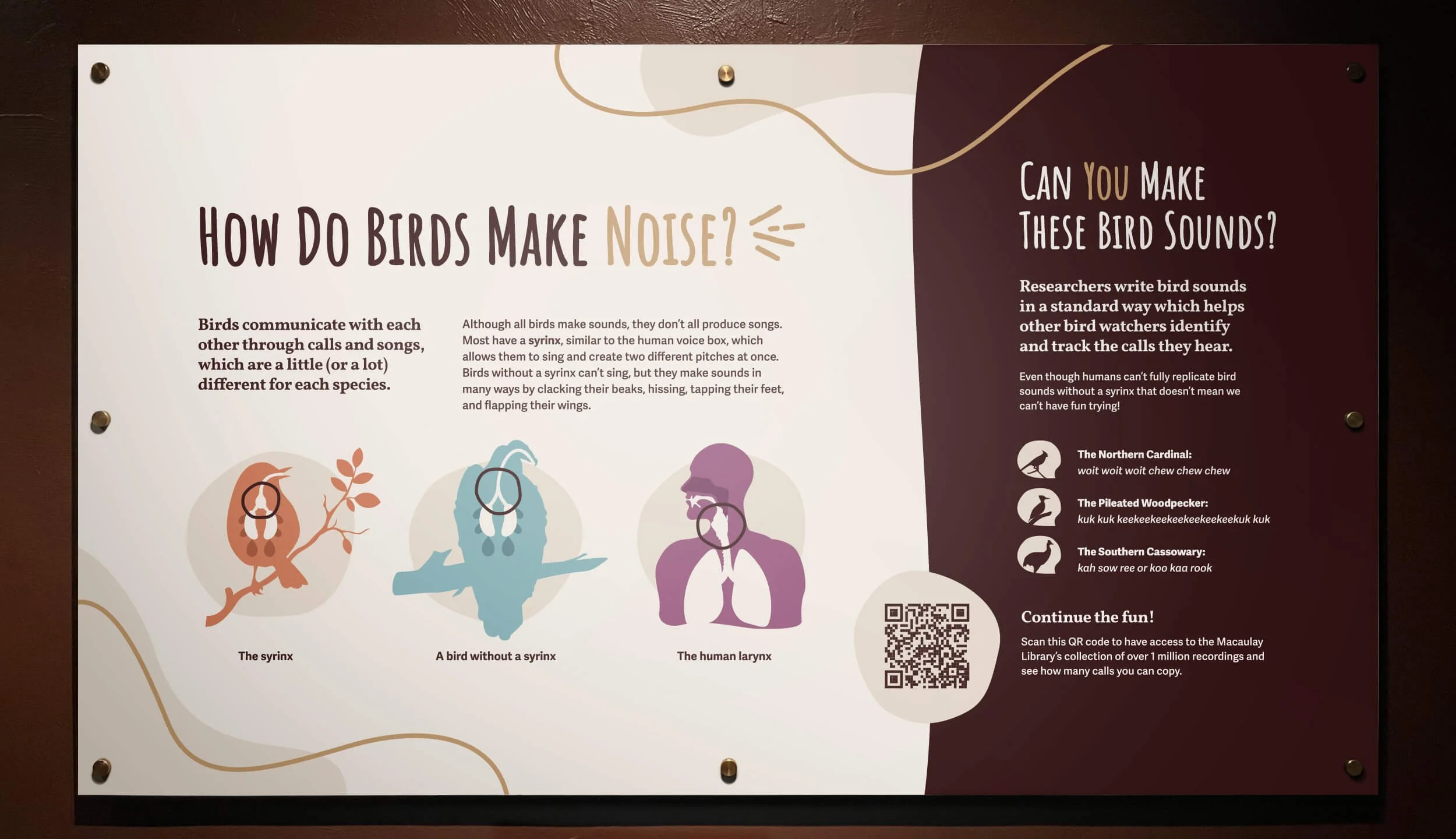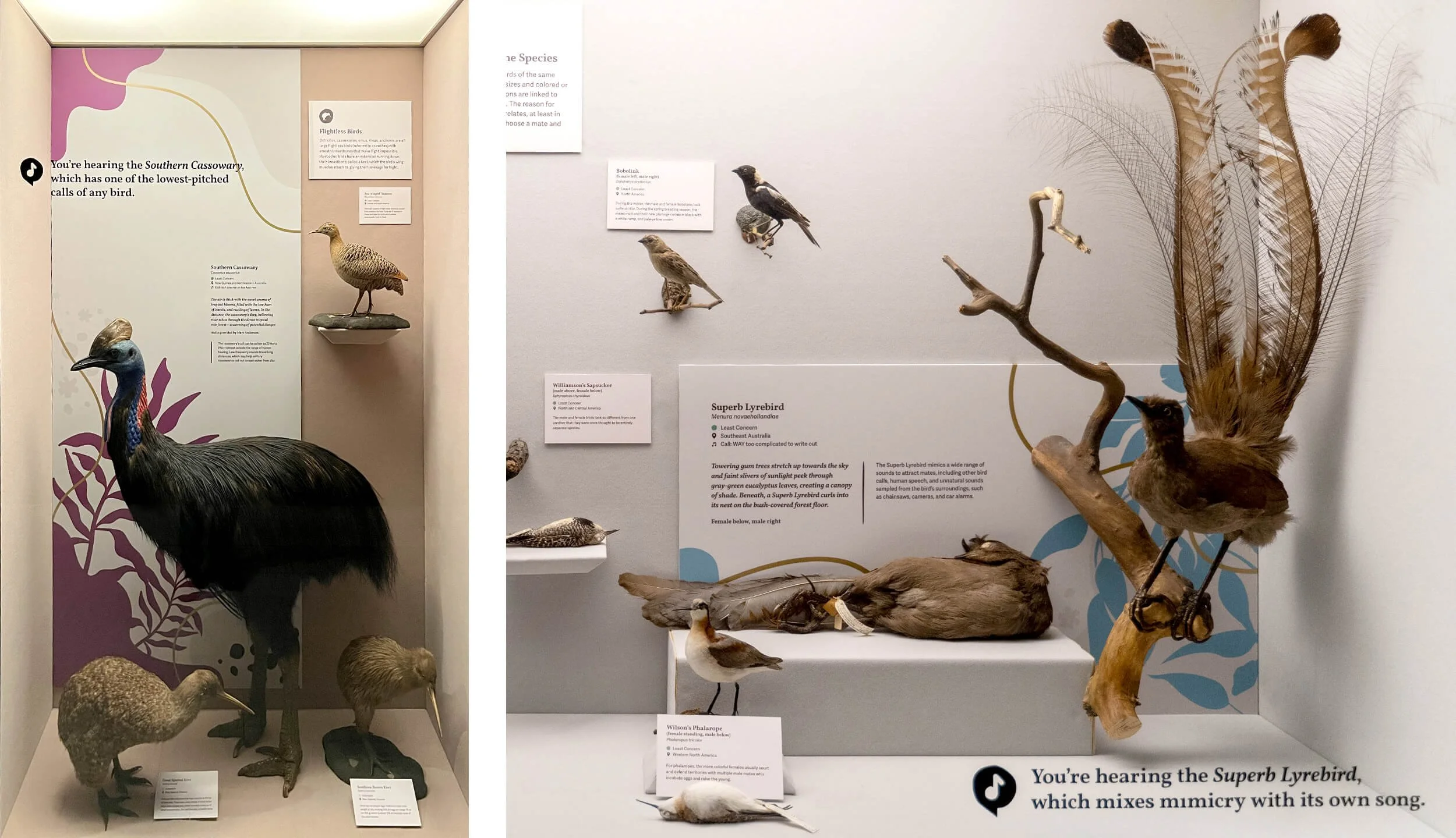 Revival came in the form of a reimagined exhibition centered around the sonic beauty of bird calls. The team collaborated with artists to weave bird sounds throughout the space, creating an immersive experience anchored by a curated selection of “hero birds.” These standout specimens received upgraded displays and fresh, engaging labels. Larger hallway panels were also transformed, and existing fixtures were refreshed with a new identity and colorful graphics sporting a newly hatched exhibition name: Chirp, Chitter, Caw! Surrounded by Birdsong. The result was an elegant, warm, and welcoming environment that finally matched the joy and wonder of its subject.