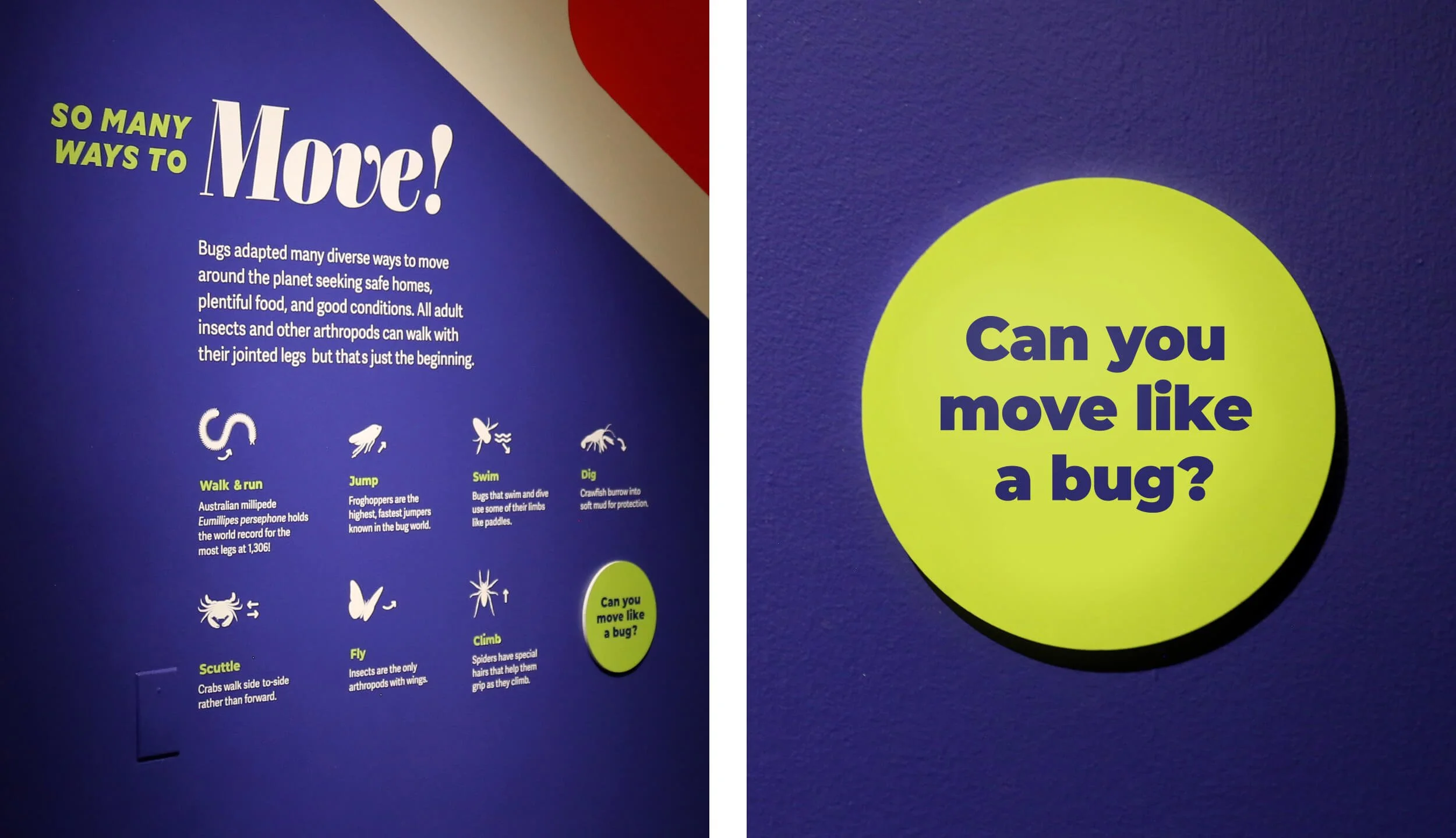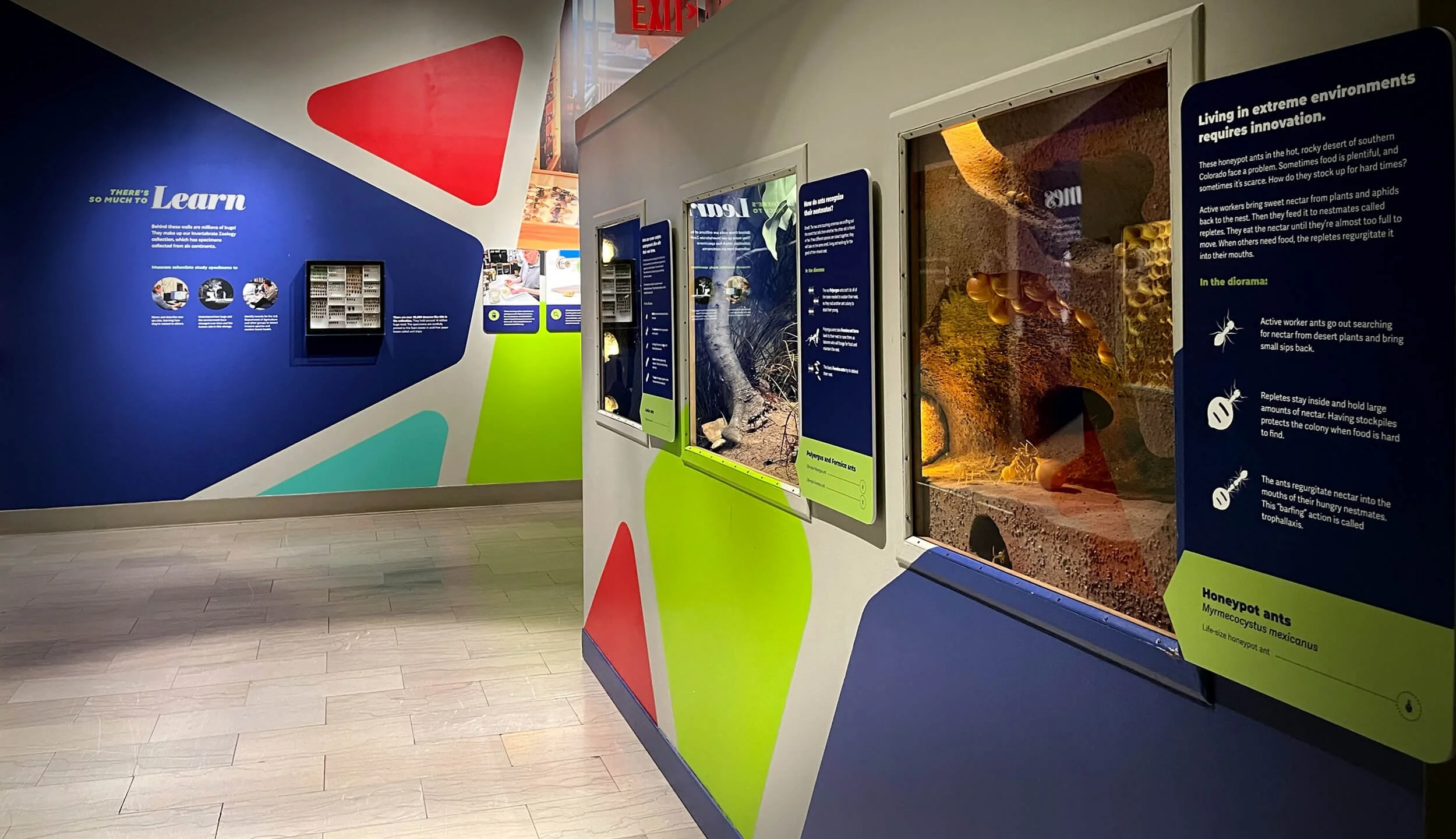 As a new creative narrative was being written to celebrate the world of bugs, I developed a bold new art direction for the space. Big images, friendly typography, and a colorful wall pattern inspired by insect wings were combined to bring a fresh energy to the hall. Once this pattern was painted on the walls and illuminated with a new lighting system, the vivid colors reflected across the polished granite floor like stained glass. Together, these elements transformed the forgotten hallway into a vibrant cathedral of critters—a tribute to the beauty and complexity of the invertebrate world.